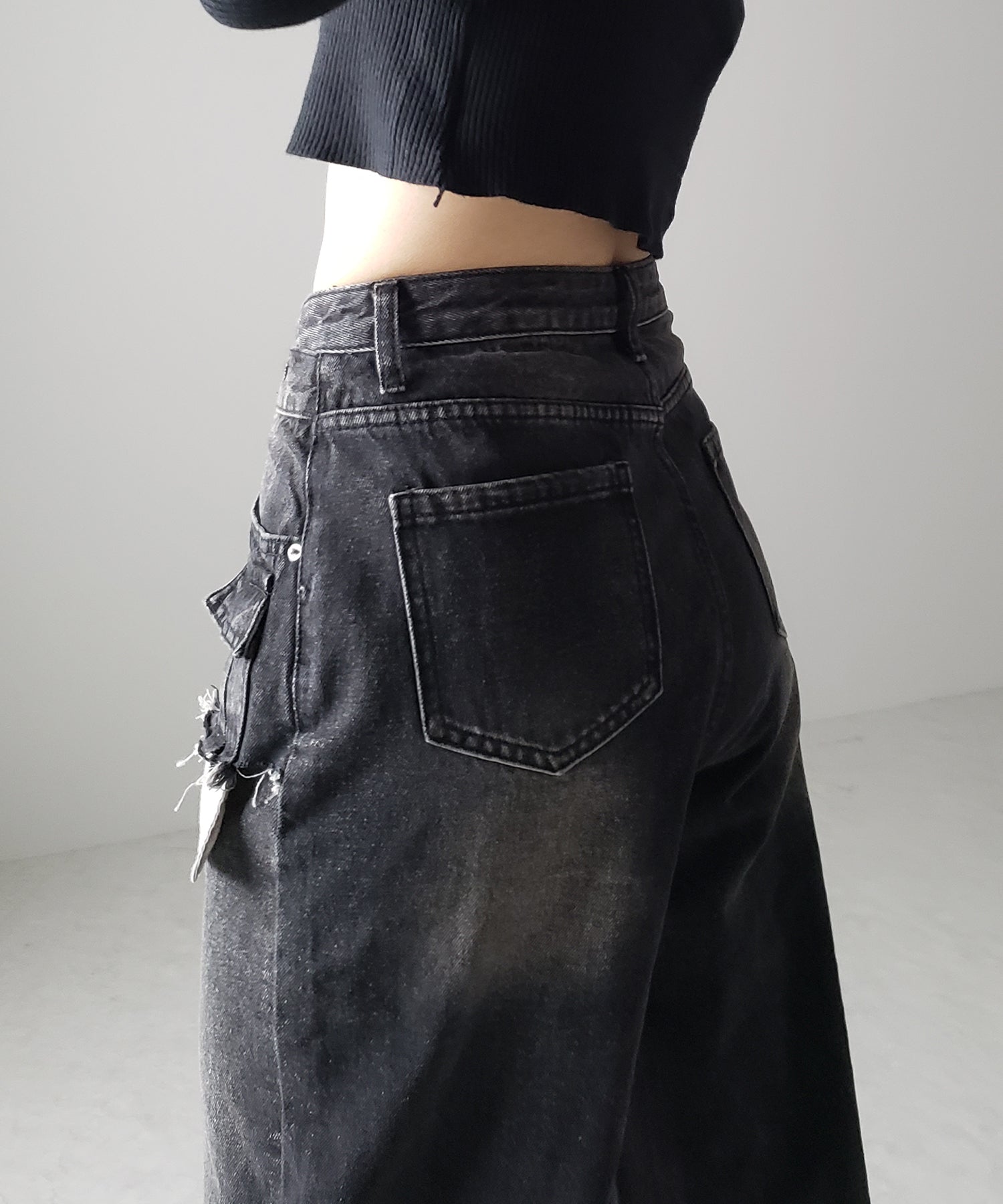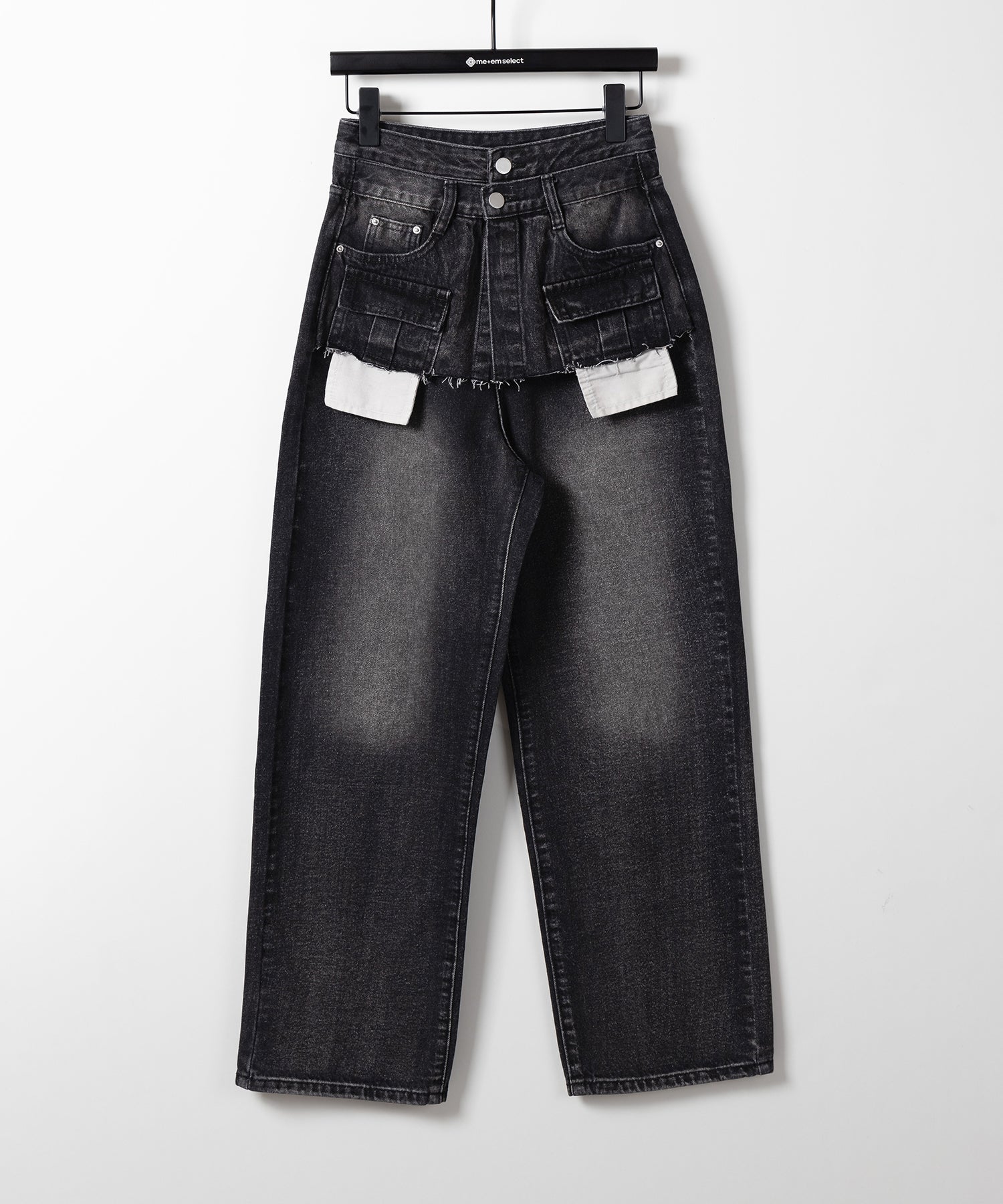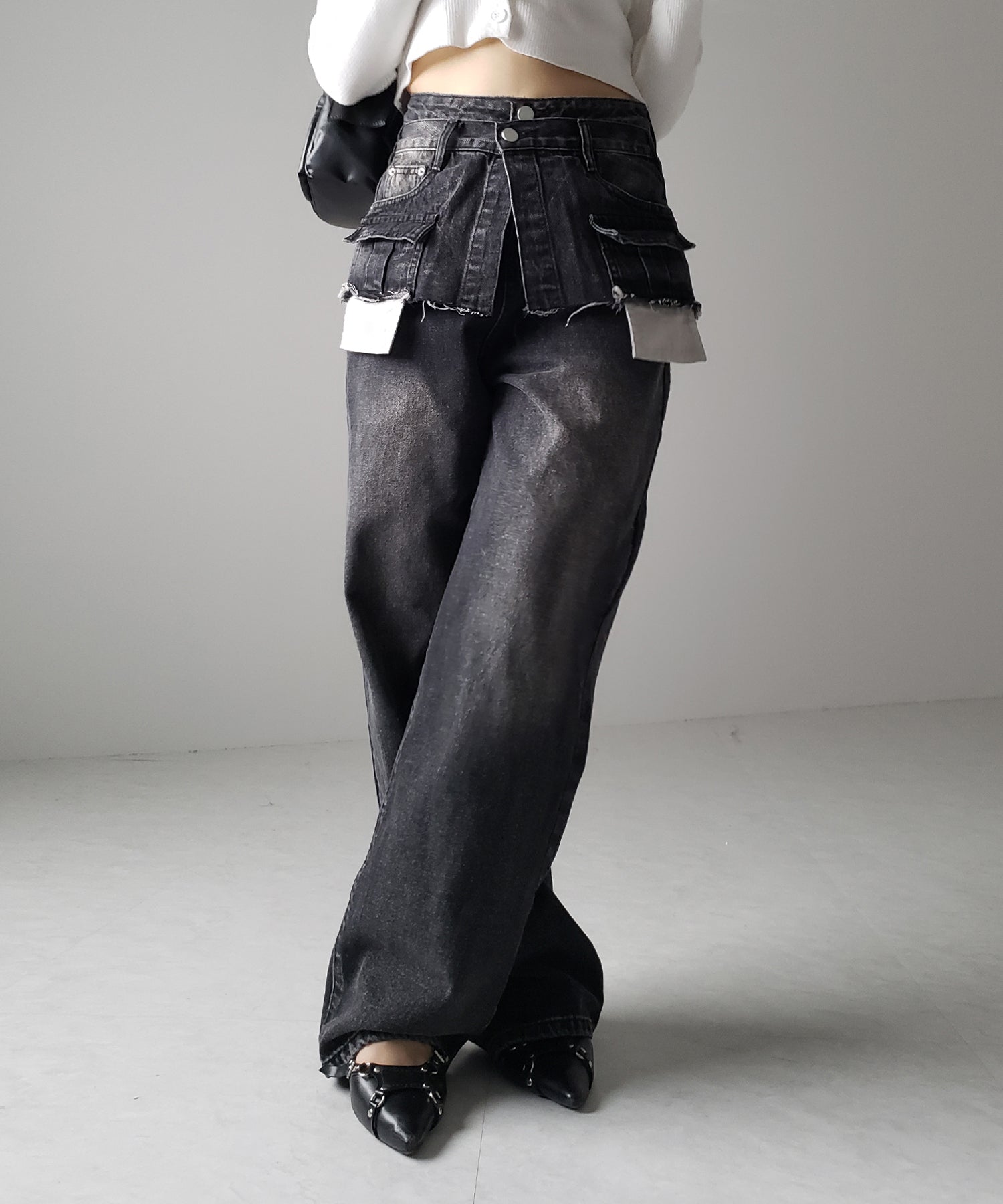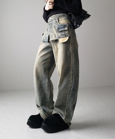 ダブルウエストダメージレイヤードヴィンテージルーズデニム