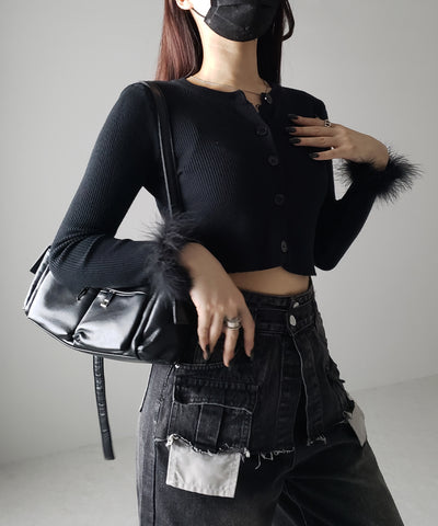 ・コンパクトなトップスと合わせてメリハリのあるスタイリングが完成。