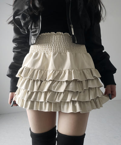 【 インナーパンツ裏地付 】ハイウエストシャーリングフリルミニスカート / high waist shirring frill mini skirt