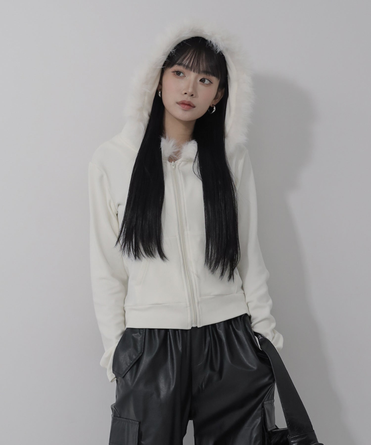 \ ふわふわファーのフーディが大人な女っぽあざとコーデを叶える、ジップアップファーフーディ /