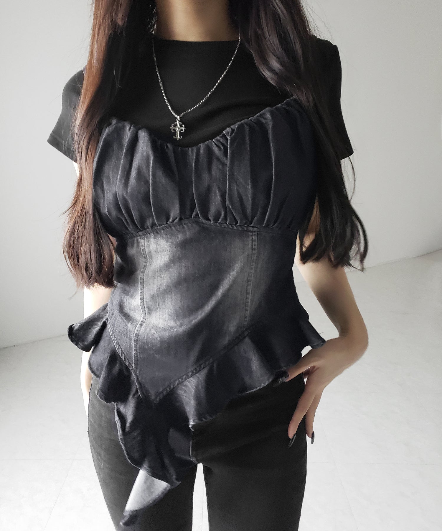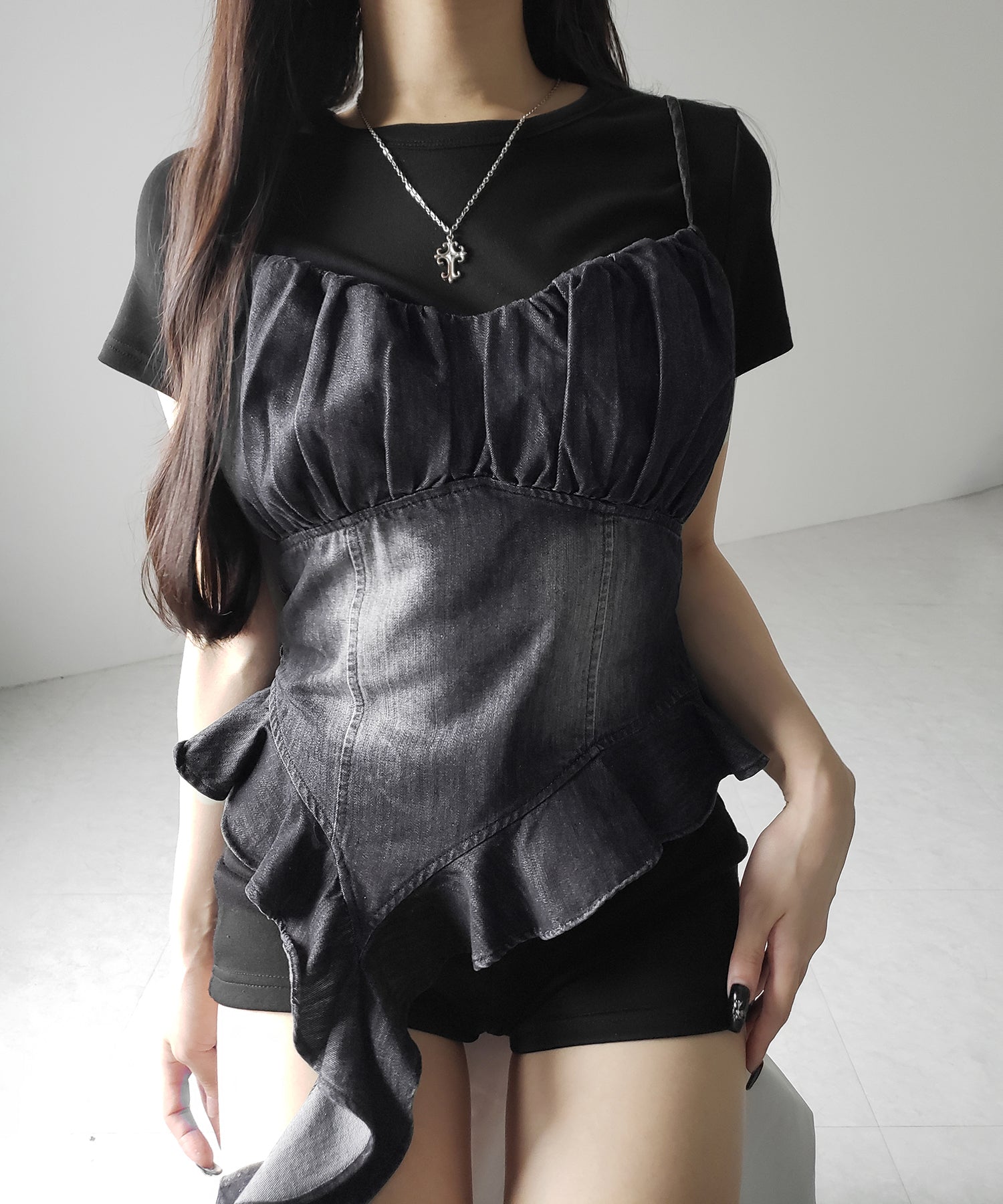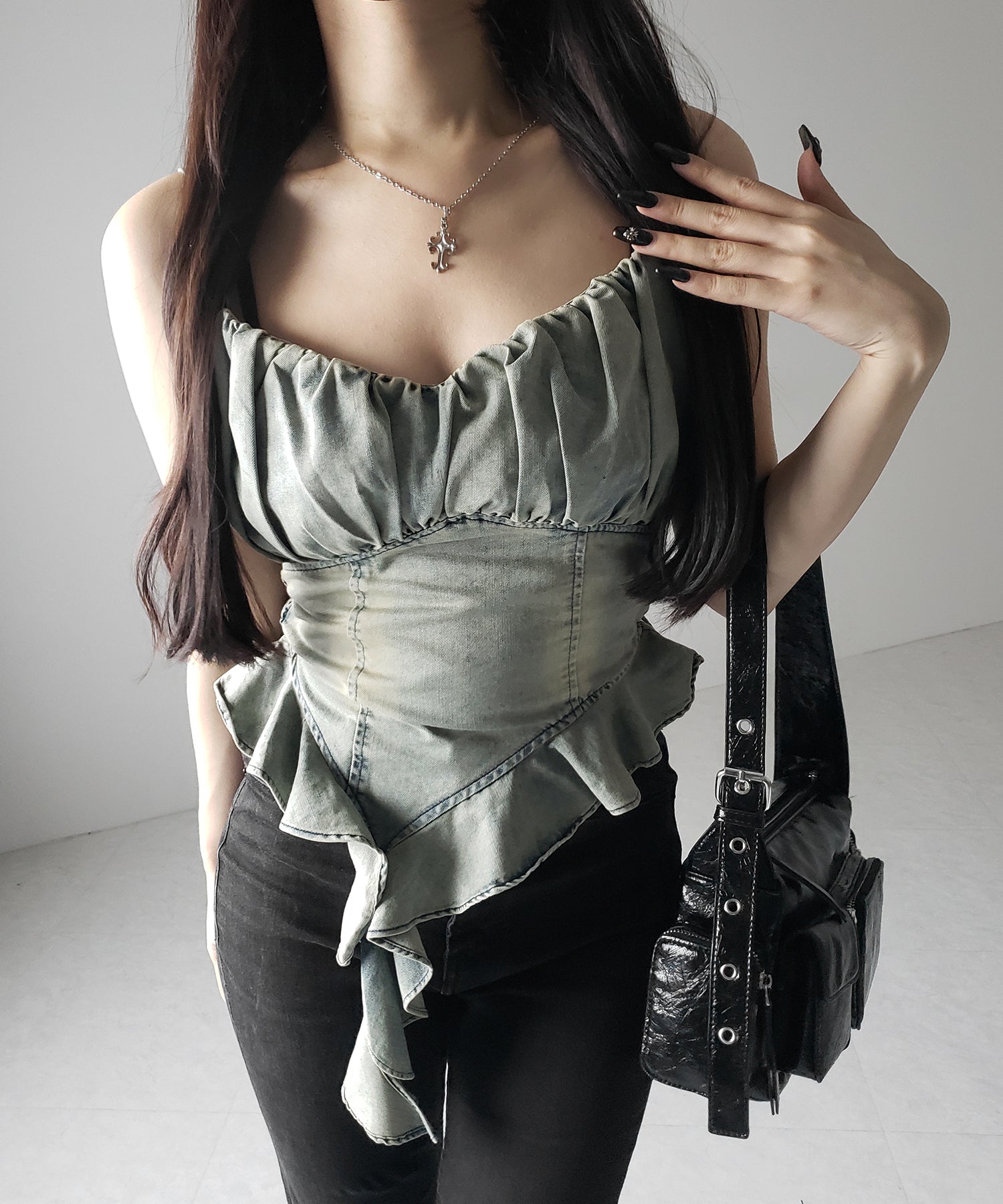 ・ヴィンテージ加工のデニムビスチェはアシンメトリーフリルがワンポイントに。