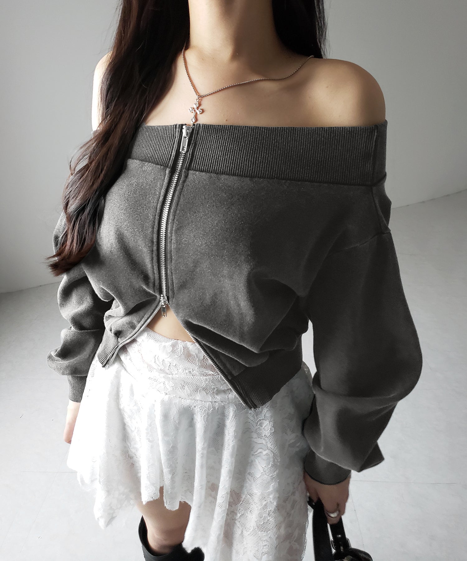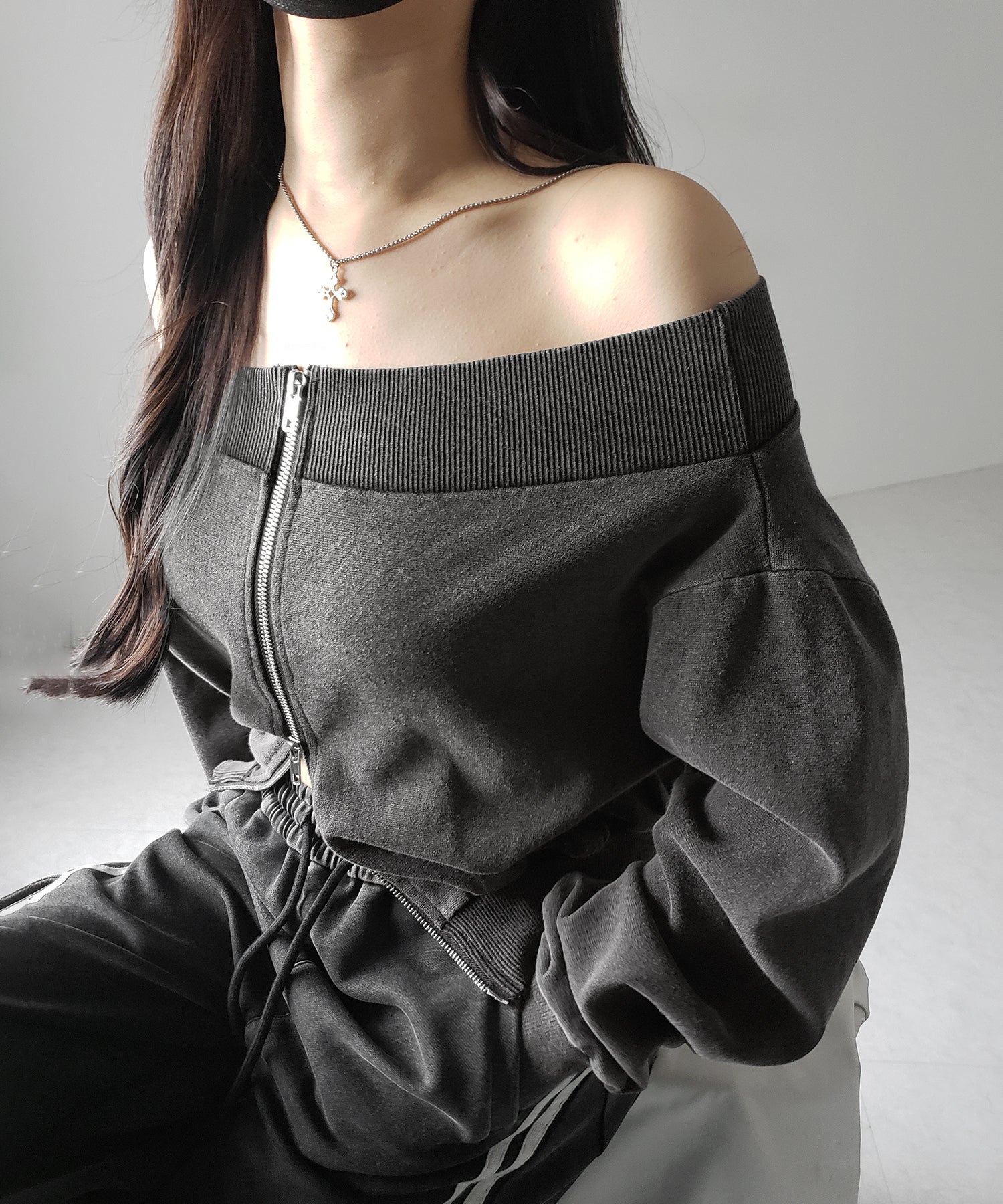 ダブルジップピグメントオフショルスウェットトップス / double zip pigment off shoulder sweat tops
