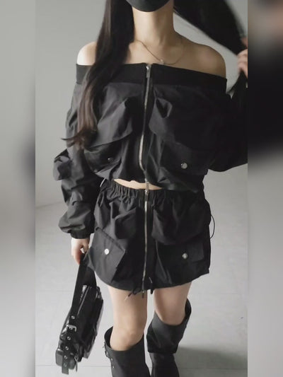 【 セットアップ 】アウトポケットオフショルカーゴブルゾン & ダブルジップカーゴミニスカート SET / out pocket off shoulder cargo blouson & double zip cargo mini skirt SET