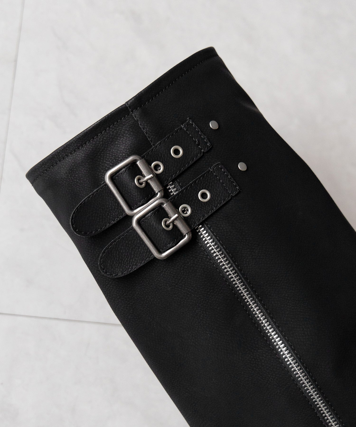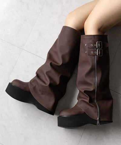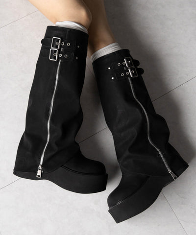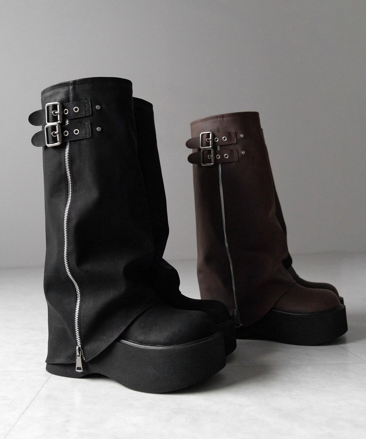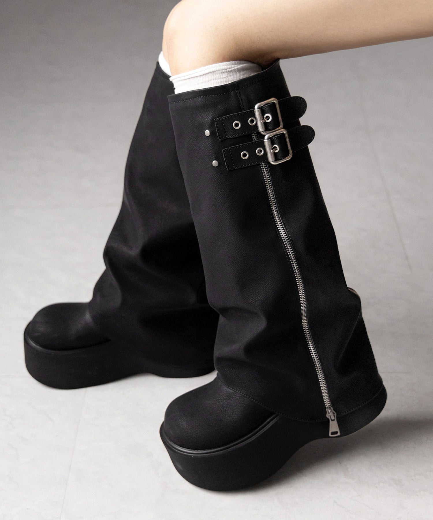 \ ぽってり厚底&2連ベルトジップデザインでストリートな韓国Y2Kスタイルを叶える、厚底カバーロングブーツ /