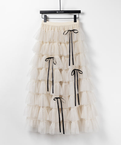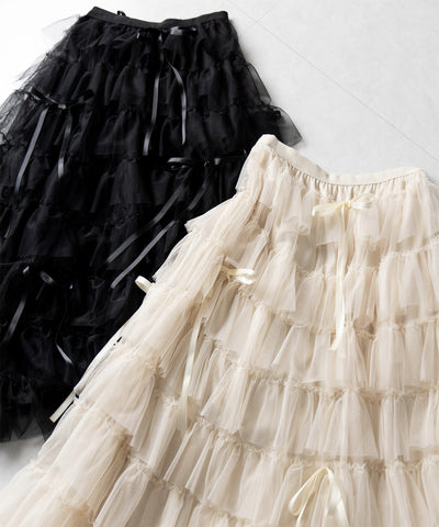 ・長めのサテンリボンが品よくアクセントに♥トレンドを叶えるボリュームチュールスカート。